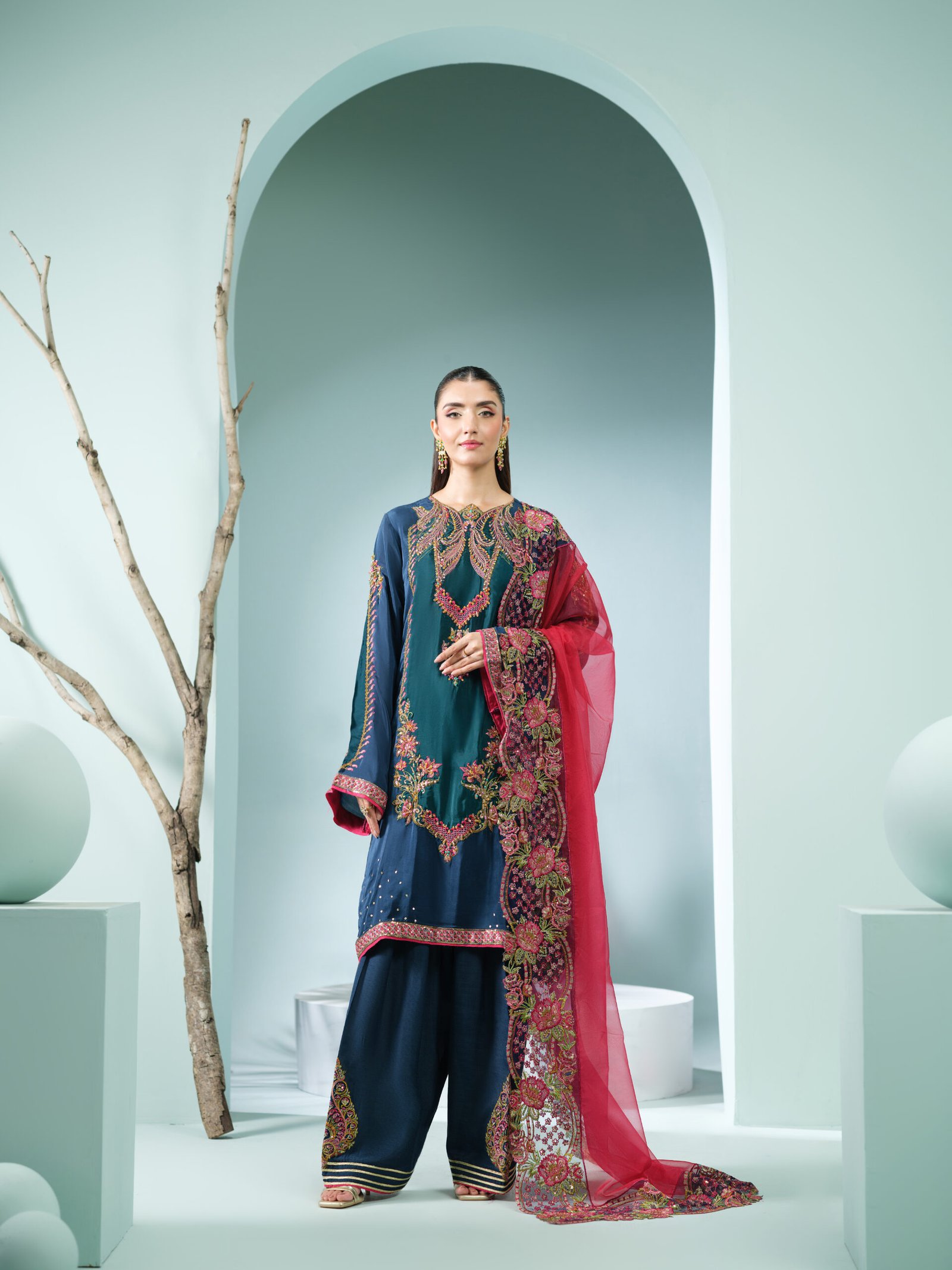 Completing the ensemble is a beautifully embroidered organza dupatta featuring refined cutwork detailing, adding lightness and sophistication to the overall look.